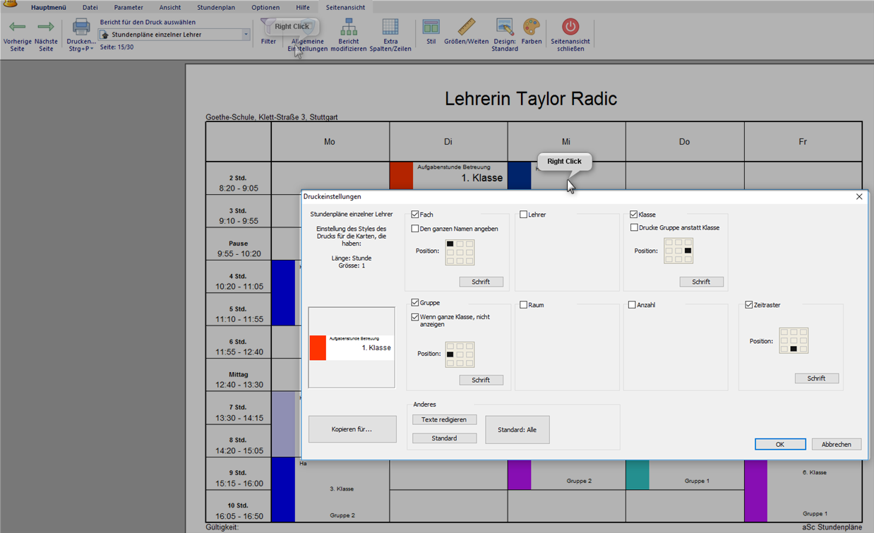 B. Die individuelle Anpassung des Stundenplanes ist im Standard-Design auch mit Rechtsklick in den Plan möglich.