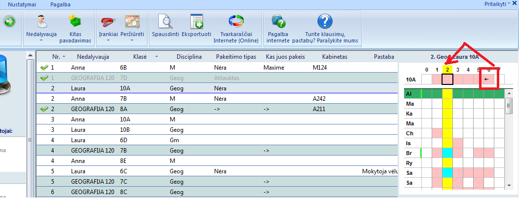 Atsivers toks langas. Programa pasiūlys atšaukti 2-rą pamoką ir perkelti 6-tą pamoką į jos vietą.
