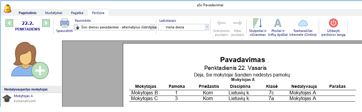 Pavyzdžiui, Mokytojas B pavaduos Mokytoją A 1-mą pamoką 7c klasėjė, o Mokytojas C pavaduos Mokytoją A 3-ią pamoką 7a klasėje.