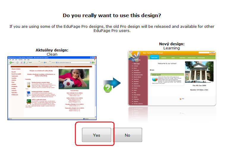 Po kliknutí na obrázok dizajnu sa dizajn vašej EduPage stránky dočasne zmení (túto zmenu vidíte iba vy, ostatní návštevníci vidia váš pôvodný dizajn) a zobrazí sa potvrdzovací dialóg. Ak ste so zvoleným dizajnom spokojný, kliknite na tlačidlo "Áno". Váš pôvodný dizajn bude nahradený novým.