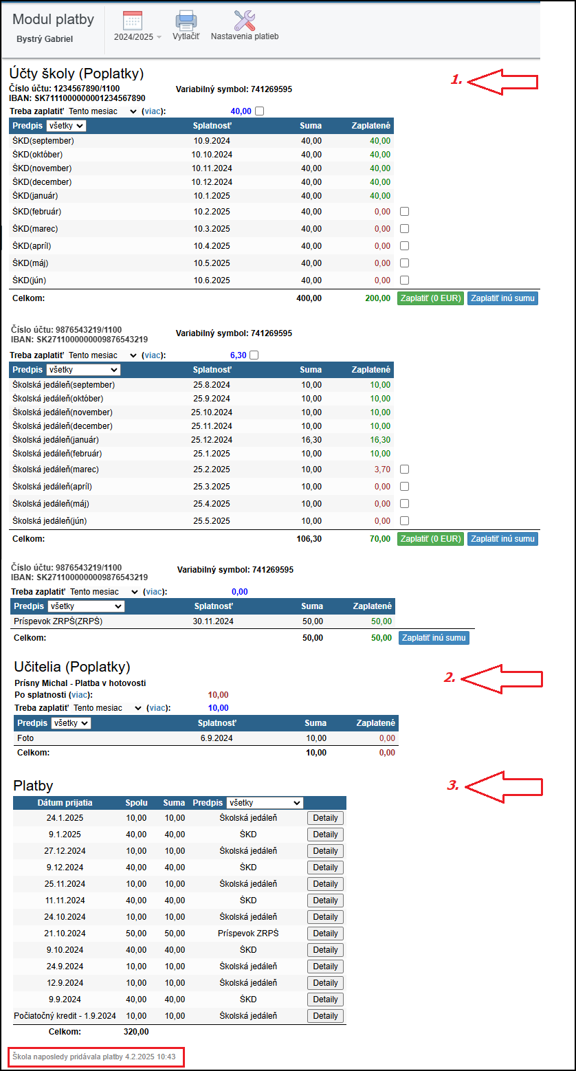 Nie každá škola zaznamenáva prijaté platby denne, rodič tu preto má zobrazovanú informáciu, kedy škola naposledy pridávala platby. Nemusí tak zbytočne kontaktovať školu, ak ešte nevidí svoju platbu a platil až po tomto termíne.