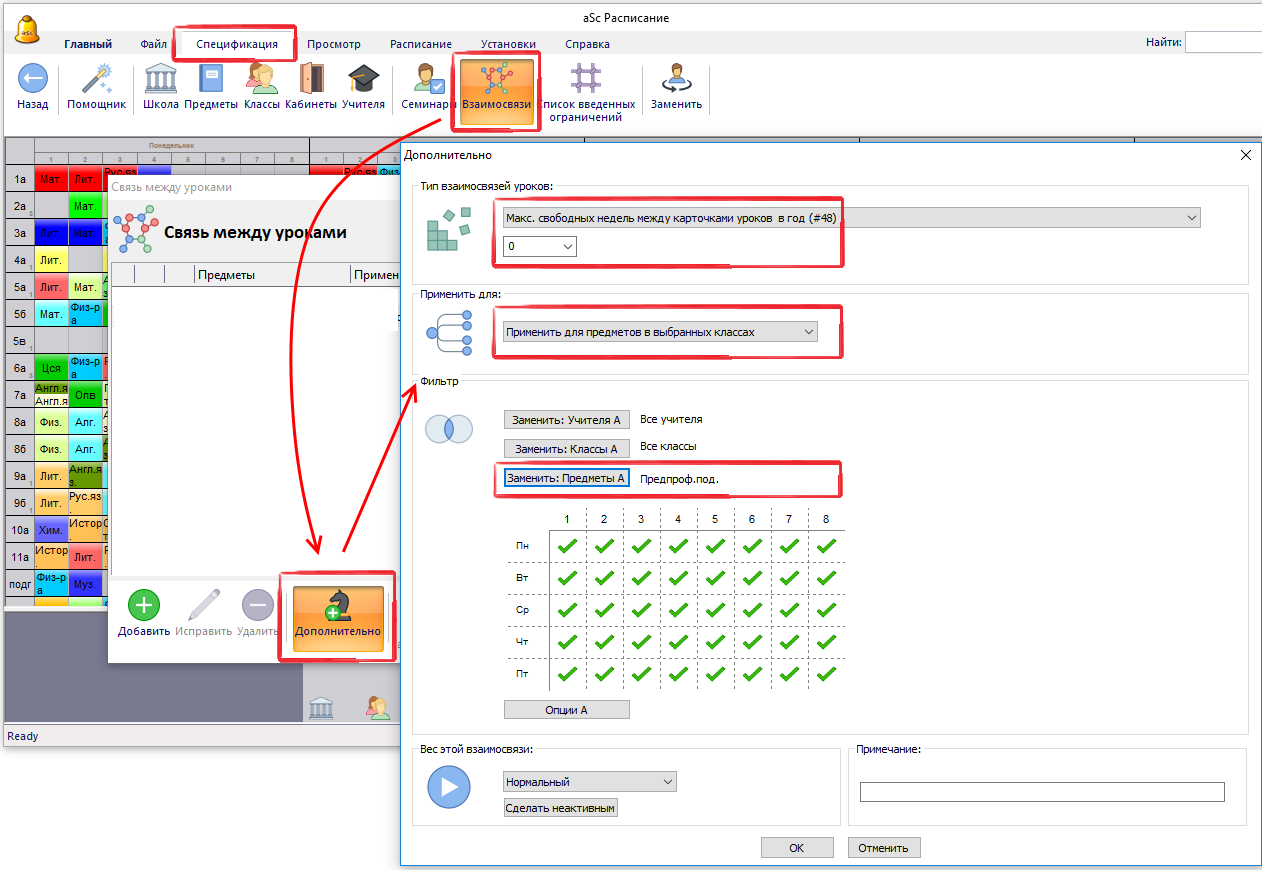 Если у Вас есть предмет, который должен быть 2 недели (семестры) подряд (он не может стоять в 1-ую неделю и потом в 4-ую, или 1-ый семестр и 4-ый семестр), то Вы можете добавить такую дополнительную взаимосвязь: