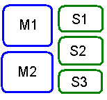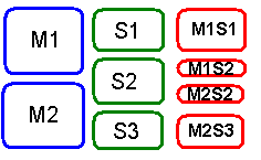 En vez de dos divisiones M1/M2 y S1/S2/S3 crearemos una división combinada: M1S1/M1S2/M2S2/M2S3. Así en el grupo MxSy hay una intersección de estudiantes del grupo Mx y Sx. Por favor, véase este cuadro: