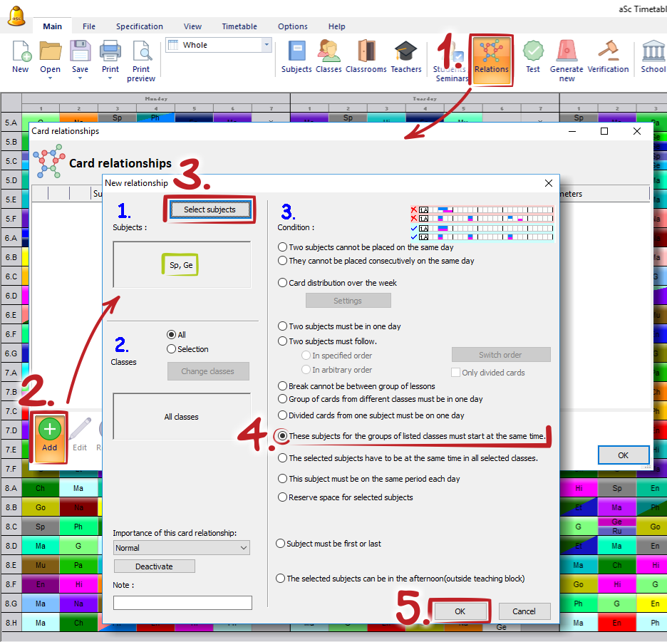 Be carefull: in most situtation you don't need to setup this cardrelationship because you assign the lessons to groups and only the groups from the same division can be at the same time. So the software will not put Spanish for Group1 together with PhysicalEducation for Boys. See Divisions