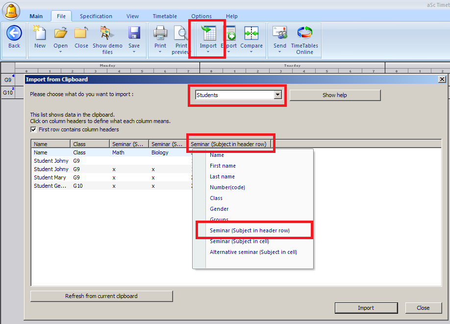 Import students' course(seminar) selections from clipboard(Excel) - Method 1
