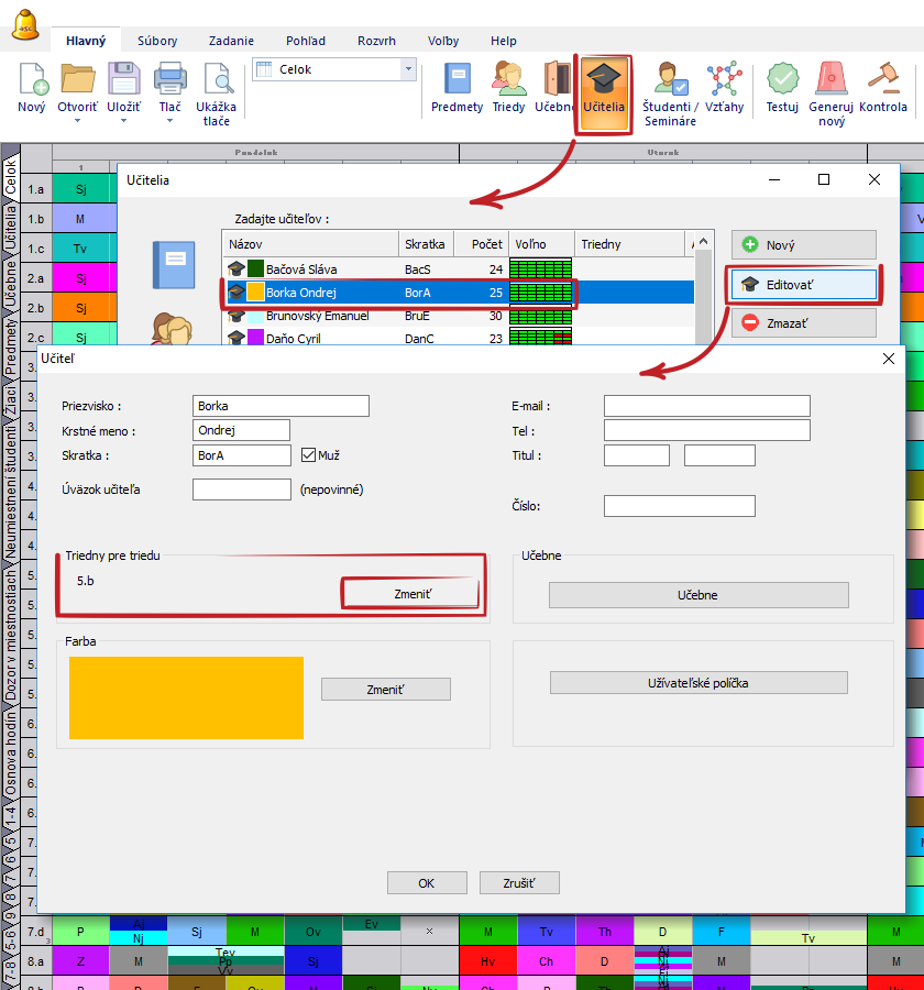 Poznámka: triedni učitelia sa používajú hlavne v programe Suplovanie a tiež v tlačových výstupoch, kde ich mená sú vytlačené v rozvrhu triedy v pravom hornom rohu.