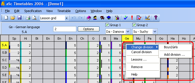Zmeniť delenie - S touto možnosťou môžete zmeniť delenie už rozdeleného predmetu. Napríklad, predmetu, ktorý je rozdelený na "1.skupinu/2.skupinu" môžete zmeniť delenie na "Angličtina 1/Angličtina 2".