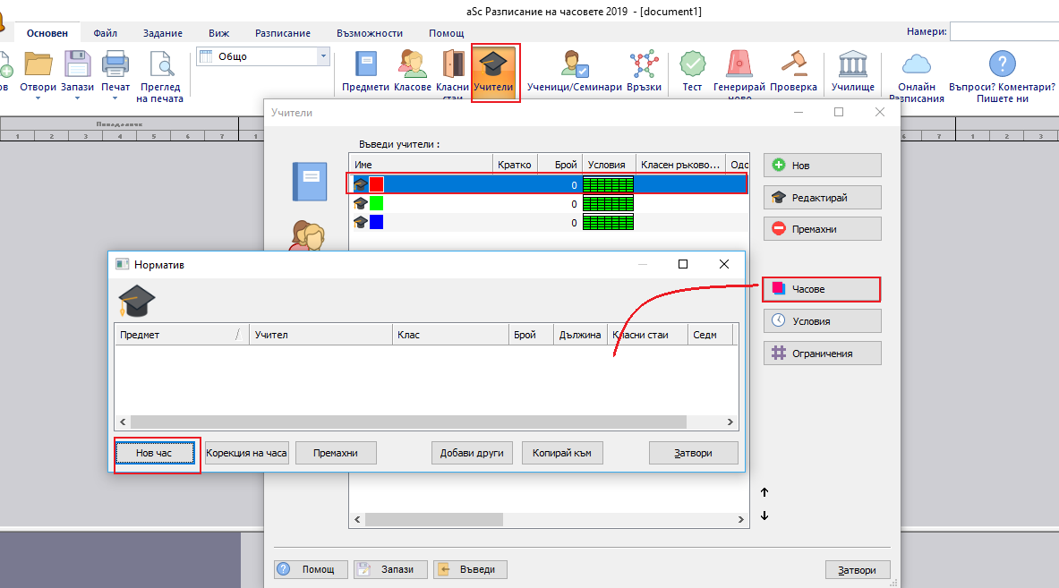 Учебният час е най-важният елемент за генериране. Часовете могат да се създават от диалогов прозорец Норматив на учителя или от Класове/Часове.