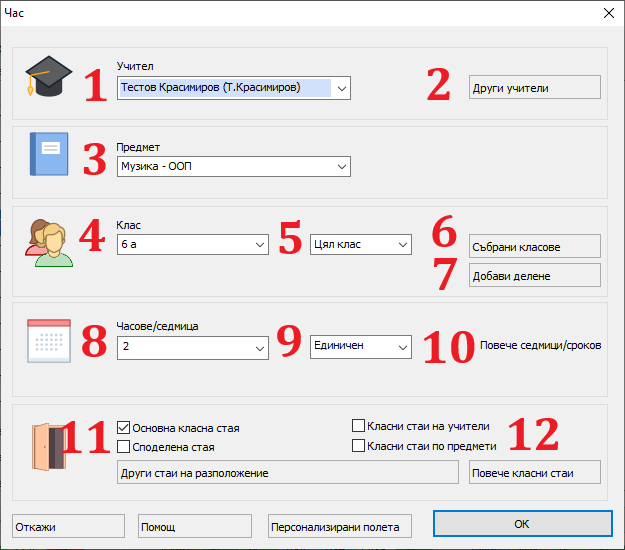 1. Учител: Тук може да изберете учител, който преподава на този клас. Може също така да изберете "Без учител", ако въвеждате някакви специални часове или все още не сте решили кой учител ще влиза в този час.