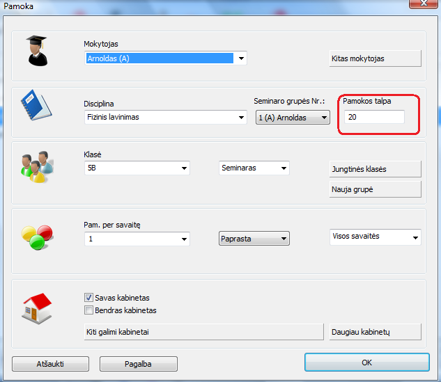 Jį galima įrašyti pamokos lange, lauke "Pamokos talpa".