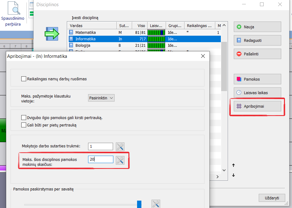 Pastaba: Ši mokinių skaičiaus disciplinai reikšmė yra naudojama tik jei pamokos aprašyme "Pamokos talpos" laukas yra paliktas tuščias. Jei jame bus įrašyta, pavyzdžiui, 15 mokinių, nors bendras apribojimas tai disciplinai yra 20 mokinių, bus naudojama pamokos aprašyme įrašyta reikšmė.