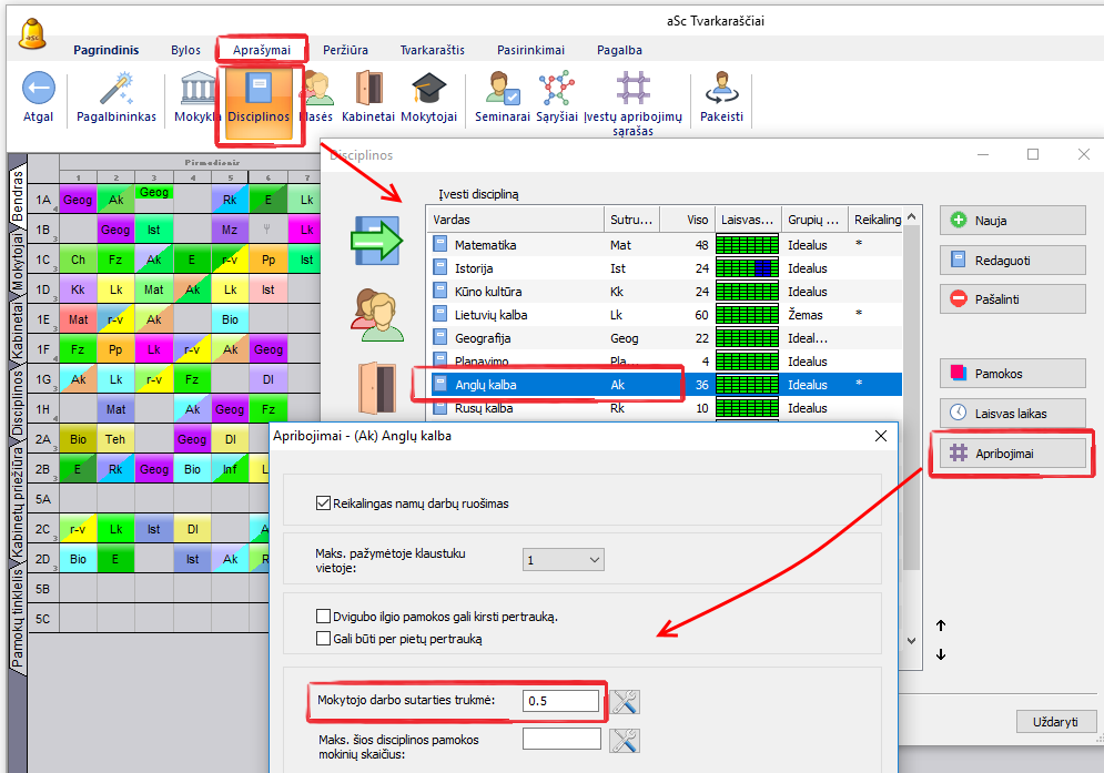 Programoje "aSc Tvarkaraščiai" galima nurodyti, kiek kiekvieno dalyko (disciplinos) pamoka prideda mokytojo darbo valandų. Pavyzdžiui, jei šnekamosios anglų kalbos pamoka yra laikoma nesudėtinga ir pridedančia 0,5 valandos prie viso darbo laiko (nors ji vienos akademinės valandos trukmės), tai galima nurodyti disciplinų aprašymų lange, paspaudus mygtuką "Apribojimai" ir įrašius 0,5 mokytojo darbo laiko trukmės lauke. Šis skaičius bus naudojamas tik apskaičiuoti mokytojo pamokas (prie bendro mokytojo pamokų skaičiaus, pavyzdžiui, atsiras 10,5 (viso pamokų per savaitę) - 10 standartinių pamokų ir viena šnekamosios anglų kalbos pamoka.