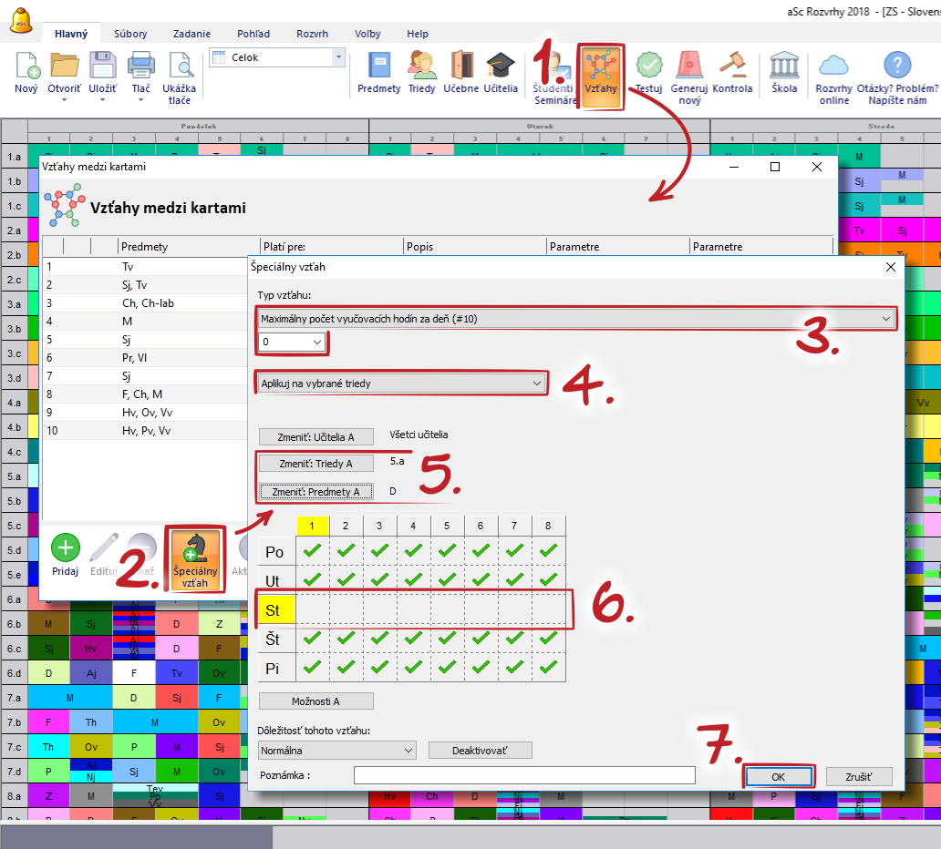V podstate zadávate do vzťahu, že vo vyznačených dňoch môže byť maximálne 0 týchto hodín. A teda napr. Dejepis v 5a môže byť iba v stredu.