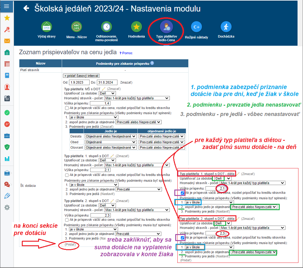 - v rámci existujúcej sekcie Št. dotácia pridajte tieto typy platiteľa s diétou