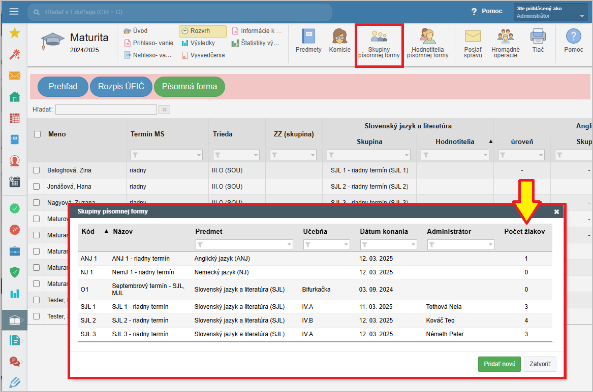 V zozname Skupiny písomnej formy vidíte počet žiakov v poslednom stĺpci:
