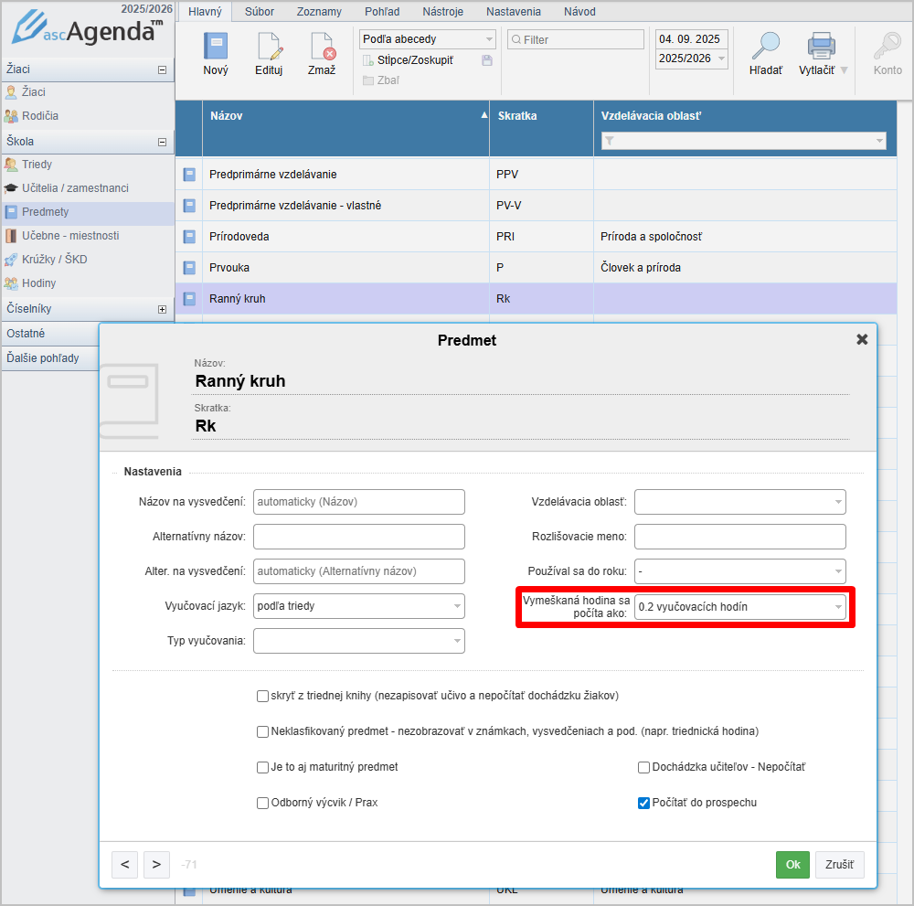 Cez "Agenda online - Predmety" si otvoríme kartu konkrétneho predmetu - Ranný kruh.