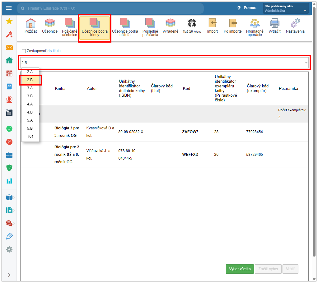 Podobne môžete použiť "Učebnice podľa učiteľa", namiesto tried sa zobrazia učebnice požičané jednotlivým učiteľom.