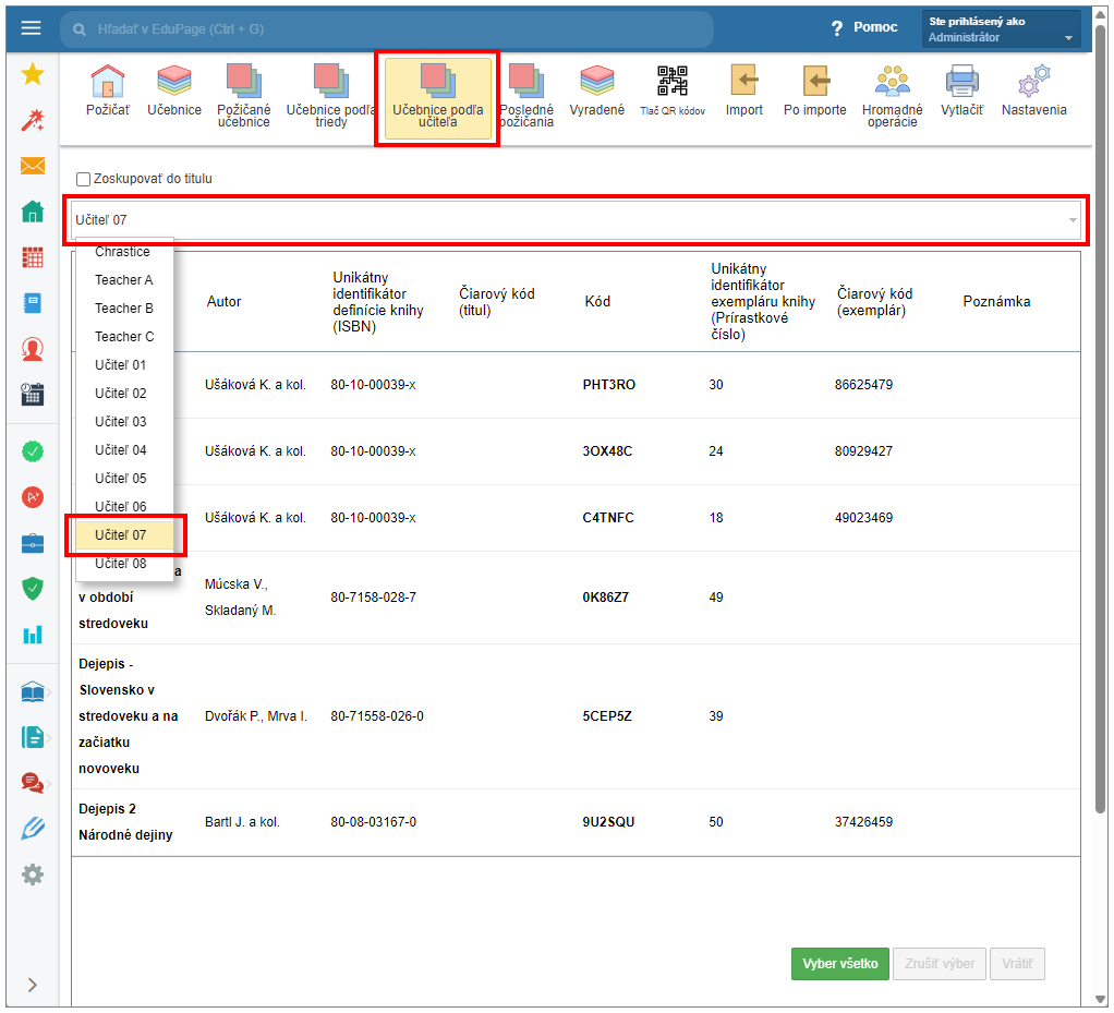 Ako administrátor a učiteľ s právami na požičiavanie a vrátenie učebníc postupujte nasledovne: