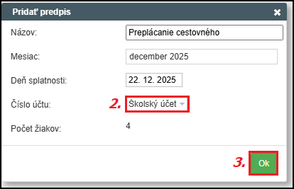 Môžete si upraviť názov predpisu, názov poplatku v danom mesiaci, určiť splatnosť predpisu a vybrať bankový účet (2.), z ktorého sa bude cestovné vyplácať. Po stlačení tlačítka OK (3.) vás systém presmeruje do modulu platby, kde nájdete vytvorený predpis.