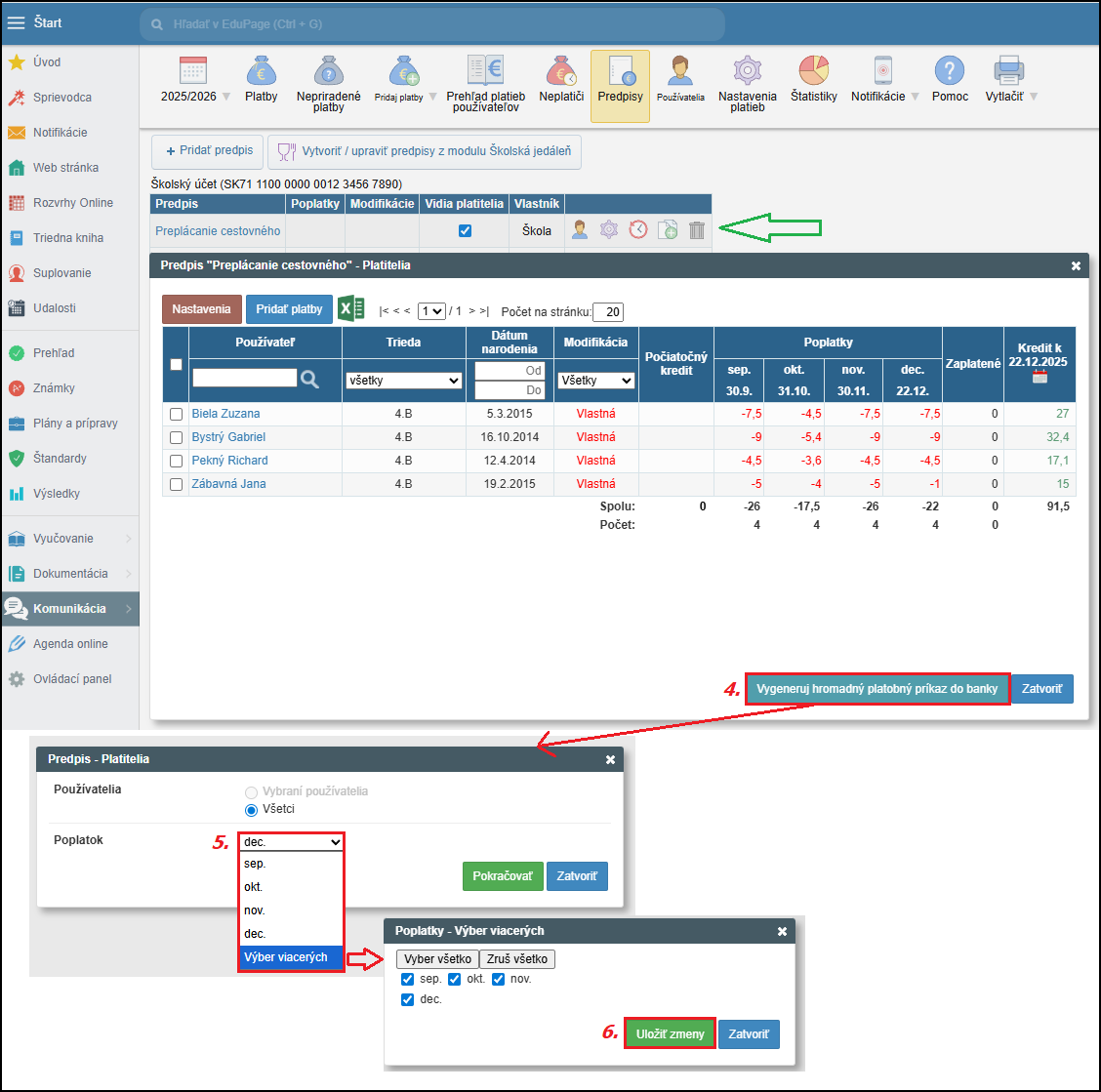 V zobrazenom predpise vidíte zoznam žiakov a sumy, ktoré majú byť žiakom vyplatené. Priamo v tomto predpise Preplácanie cestovného si môžete vygenerovať hromadný platobný príkaz do banky (4.). Ak cestovné vyplácate za viac mesiacov (napr. september - december), tak použite výber viacerých mesiacov (5., 6.).
