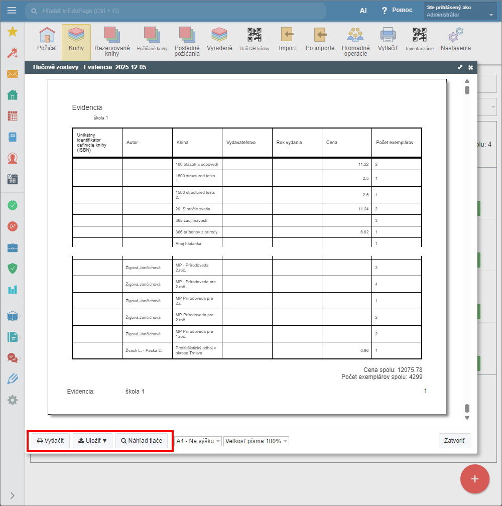 V module Knižnica/Sklad učebníc v hornom menu vyberte možnosť "Vytlačiť".