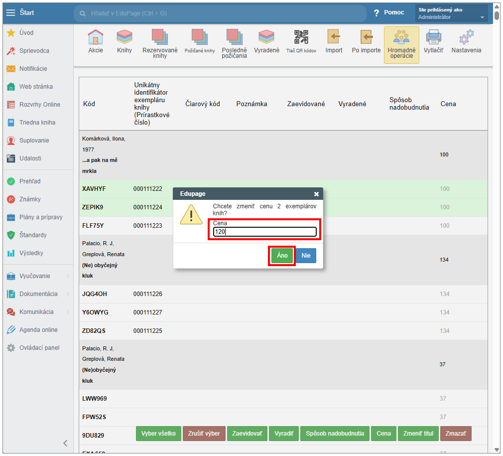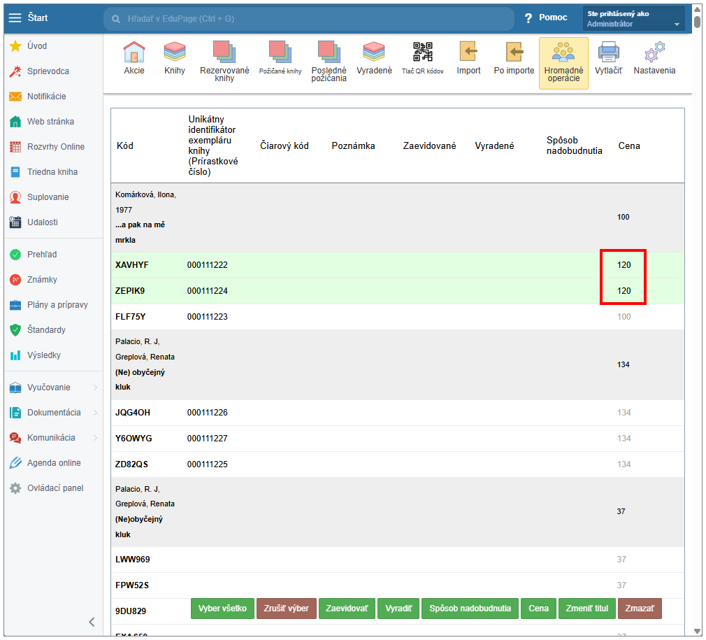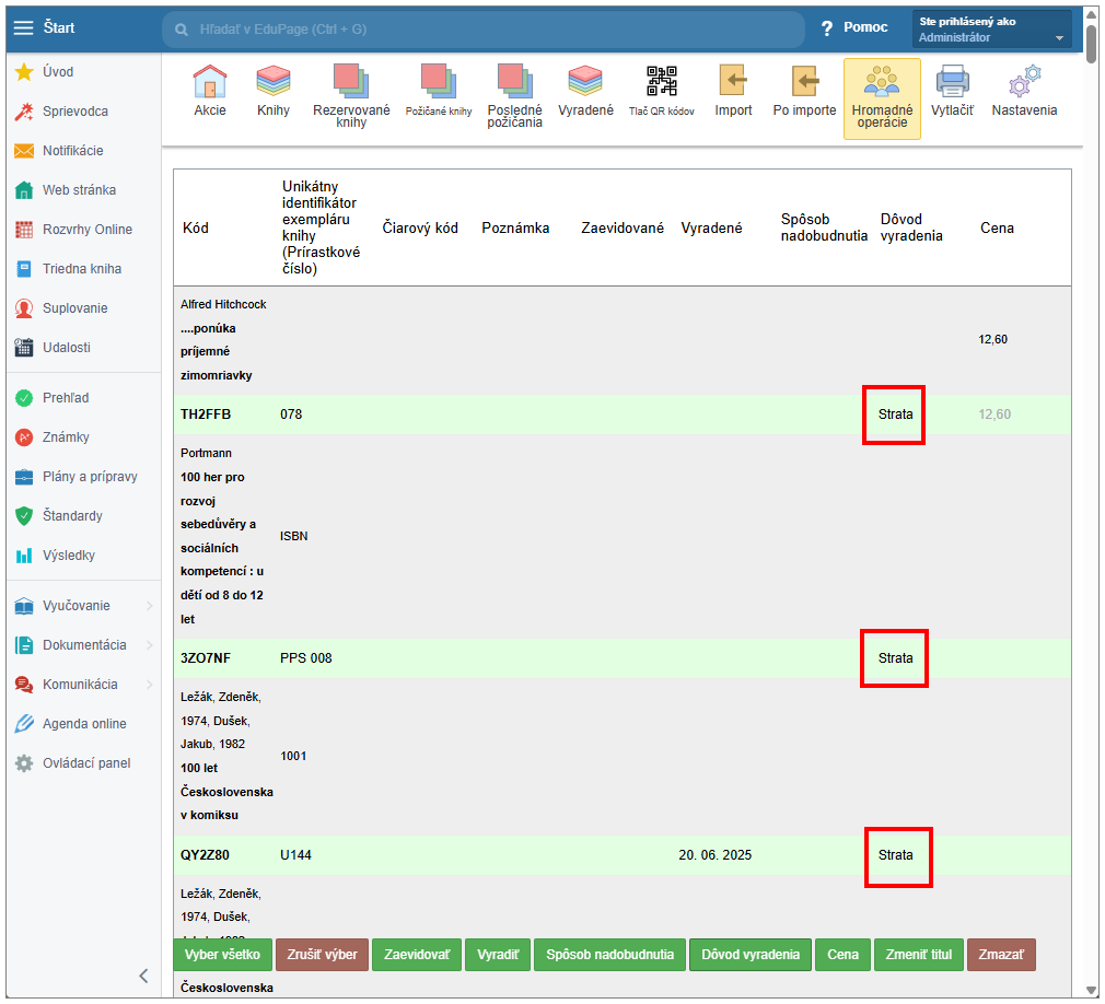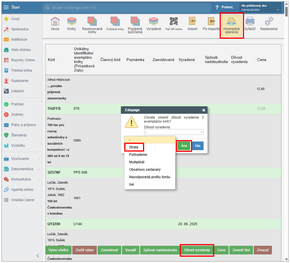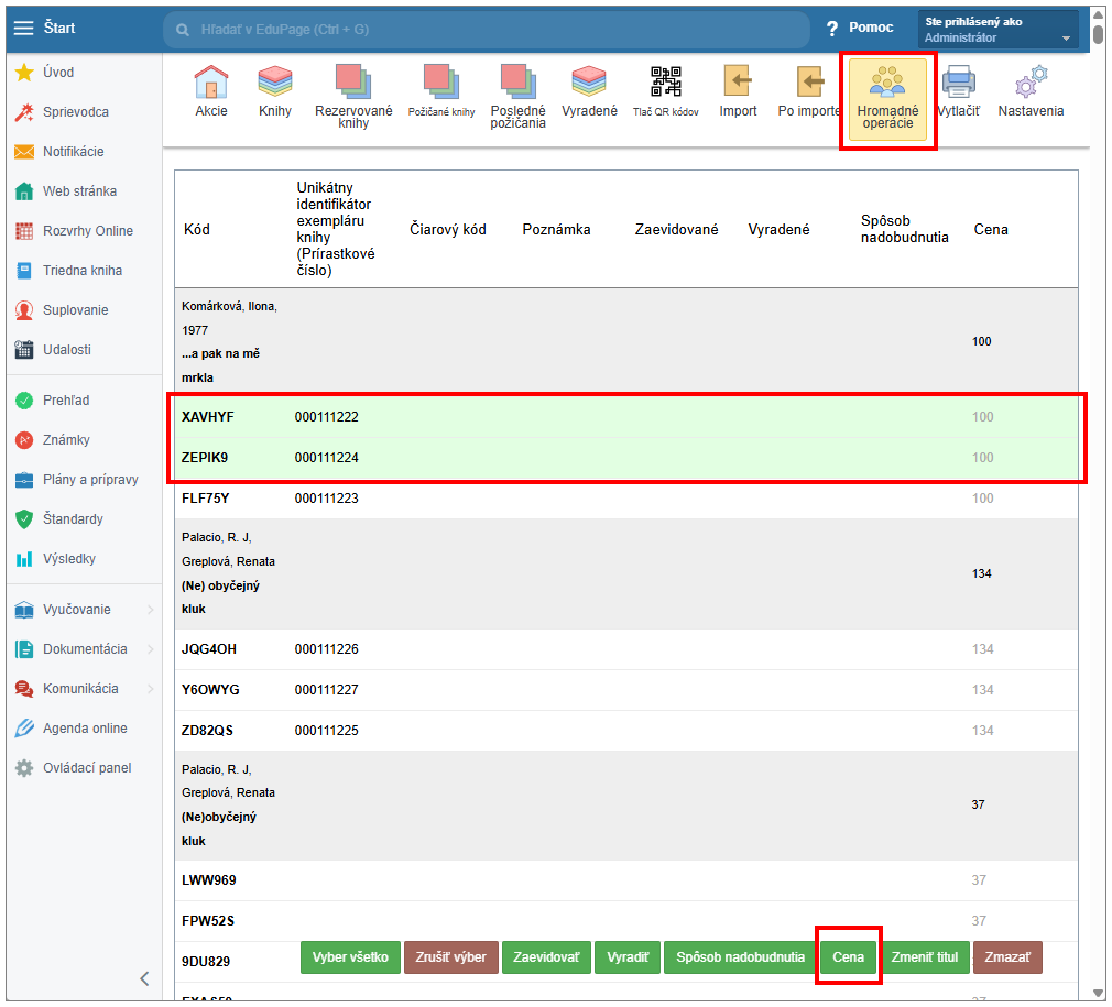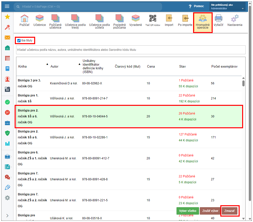 Hromadné operácie v module Knižnica / Sklad učebníc