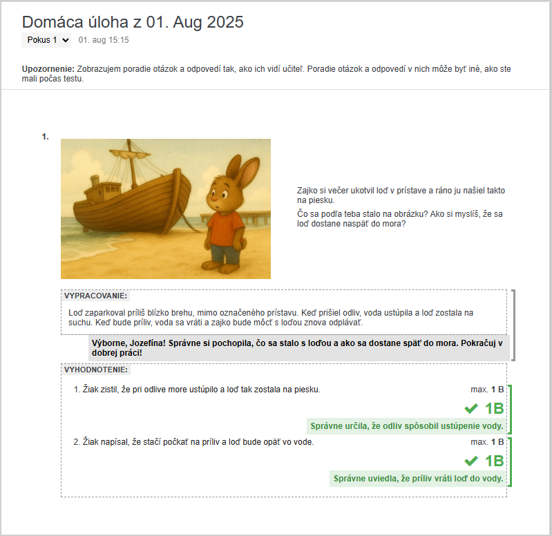 Žiak aj uvidí celkový komentár, kritériá i kometnáre ku kritériám:
