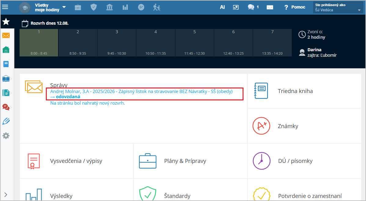 Pri východzom nastavení Zápisný lístok akceptuje iba administrátor. Môže však prideliť právo administrácie inému zamestnancovi, napr. vedúcej školskej jedálne: