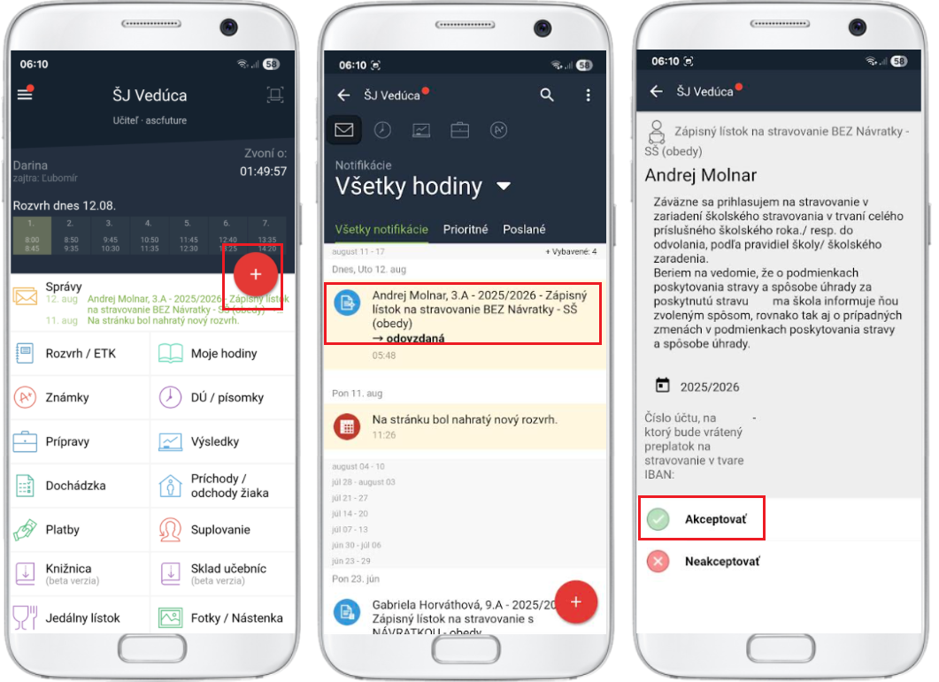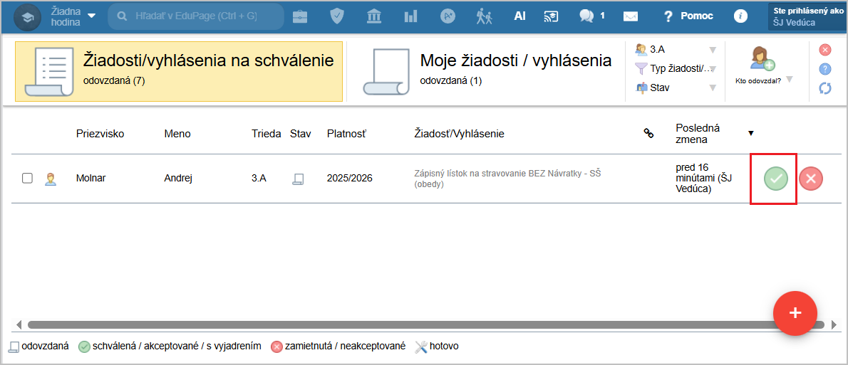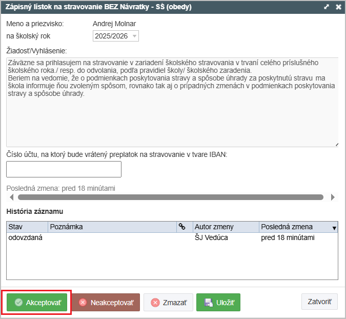 Akceptovaním žiadosti dostane rodič spätnú väzbu o tom, že škola jeho žiadosť eviduje.