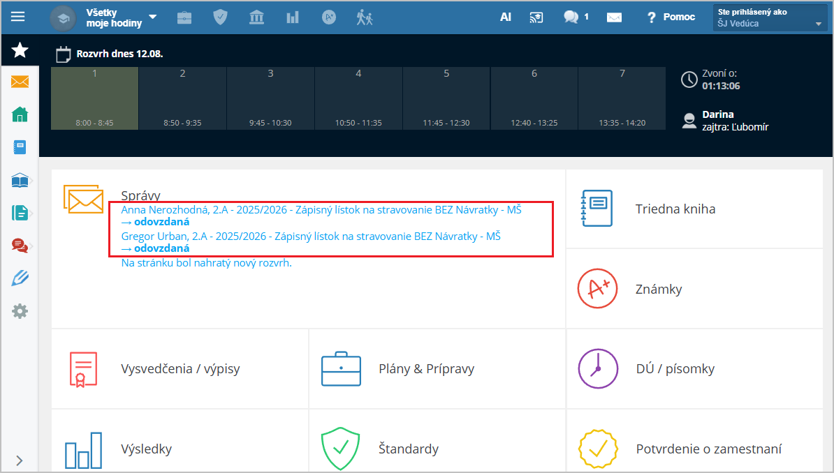 Pri východzom nastavení Zápisný lístok akceptuje iba administrátor. Môže však prideliť právo administrácie inému zamestnancovi, napr. vedúcej školskej jedálne: