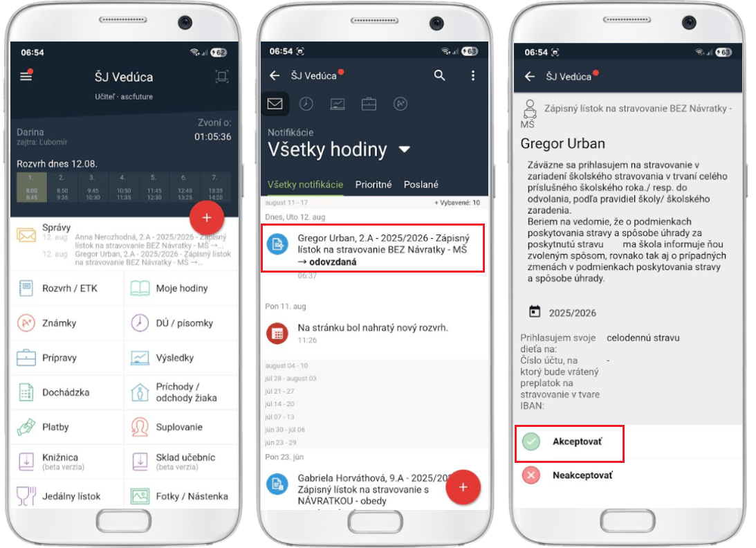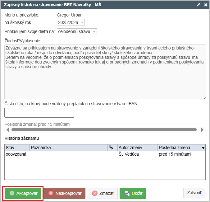 Akceptovaním žiadosti dostane rodič spätnú väzbu o tom, že škola jeho žiadosť eviduje.
