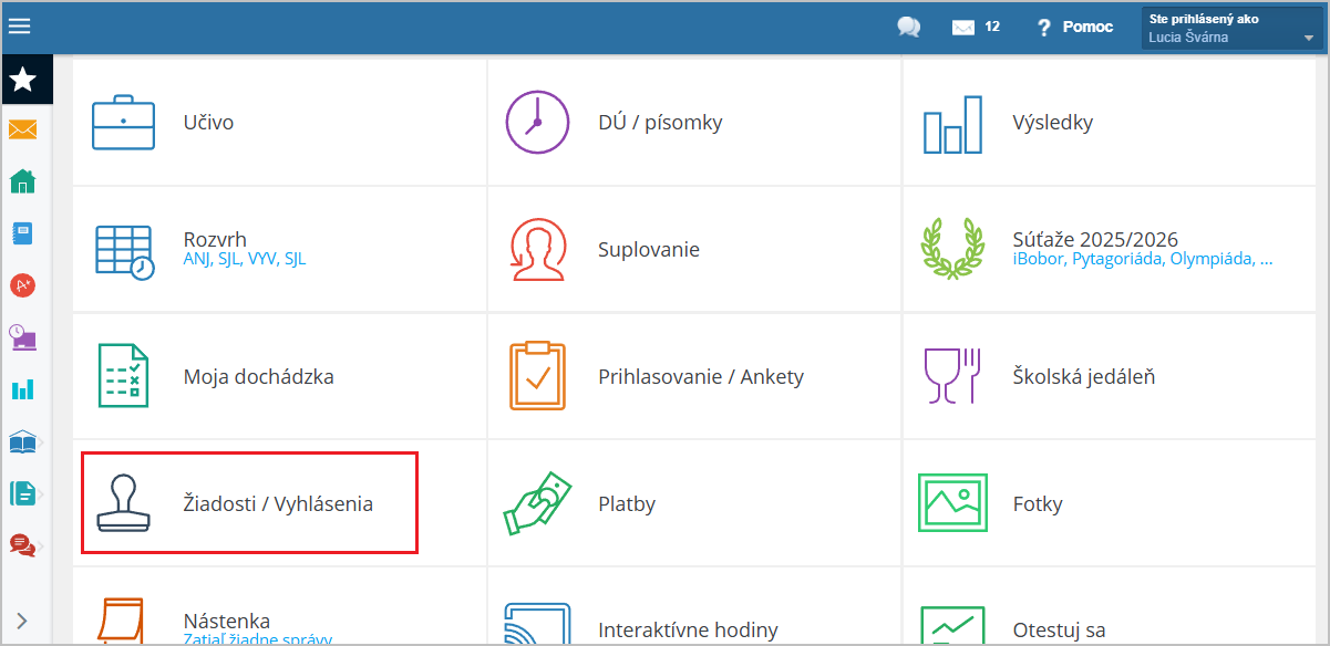 Prihláste sa do svojho rodičovského konta a v module 'Žiadosti / Vyhlásenia' pomocou tlačidla 'červené +' vyberte Zápisný lístok: