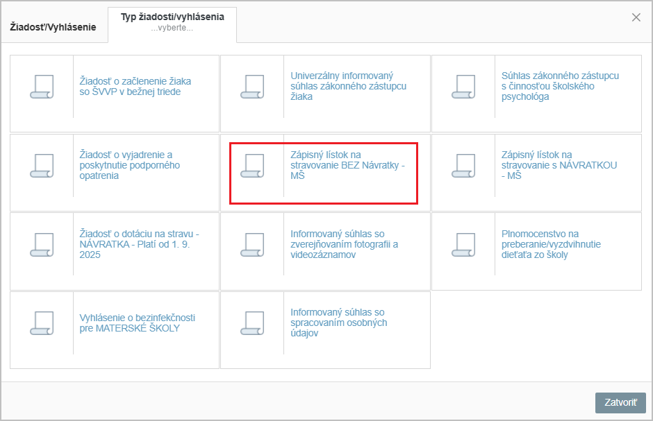 Zo zoznamu dostupných žiadostí a vyhlásení vyberte Zápisný lístok na stravovanie BEZ Návratky - MŠ.