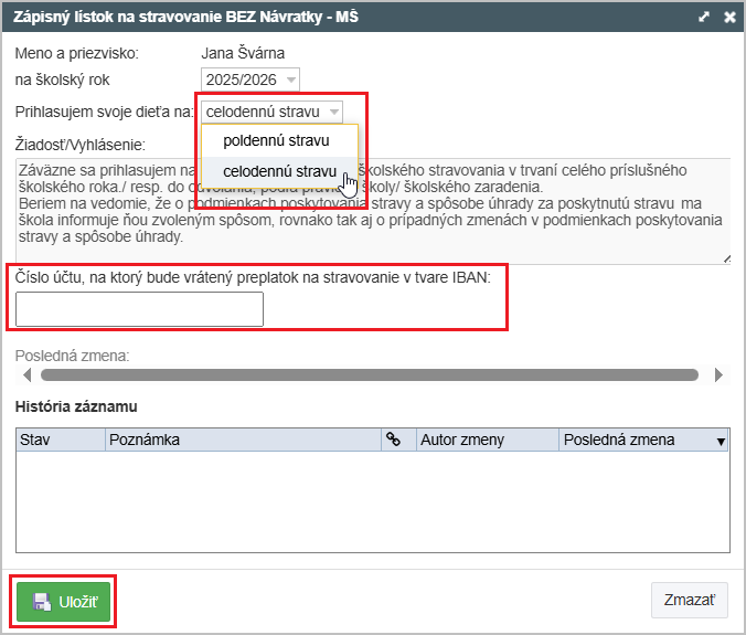 Vyberte, či dieťa prihlasujete na celodennú alebo poldennú stravu a vyplňte číslo účtu v tvare IBAN, na ktorý má byť vrátený preplatok