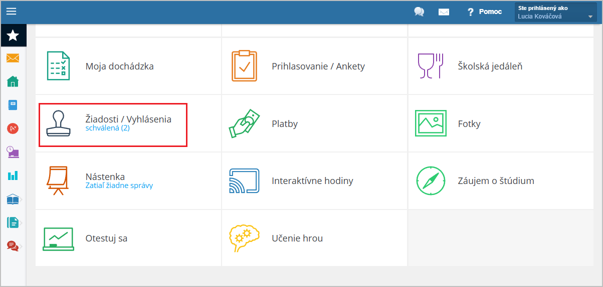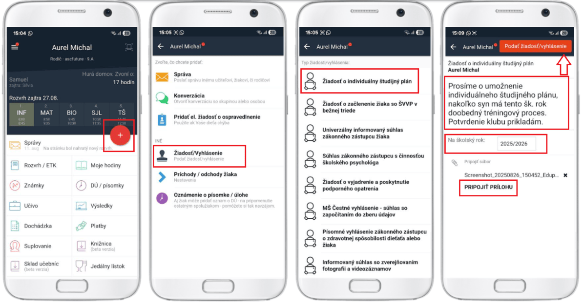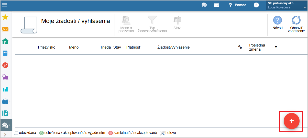 Po prihlásení sa na webe do rodičovského konta v module 'Žiadosti / Vyhlásenia' vyberte žiadosť pomocou tlačidla 'červené +' :