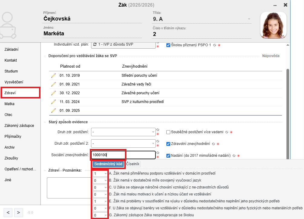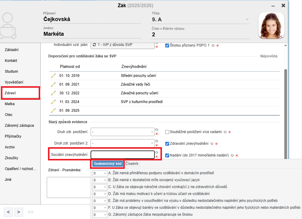 Sedemiestny kód definujúci hodnotenie žiaka môžete zadať v karte žiaka - položka "zdraví" - "sociální znevýhodnění":