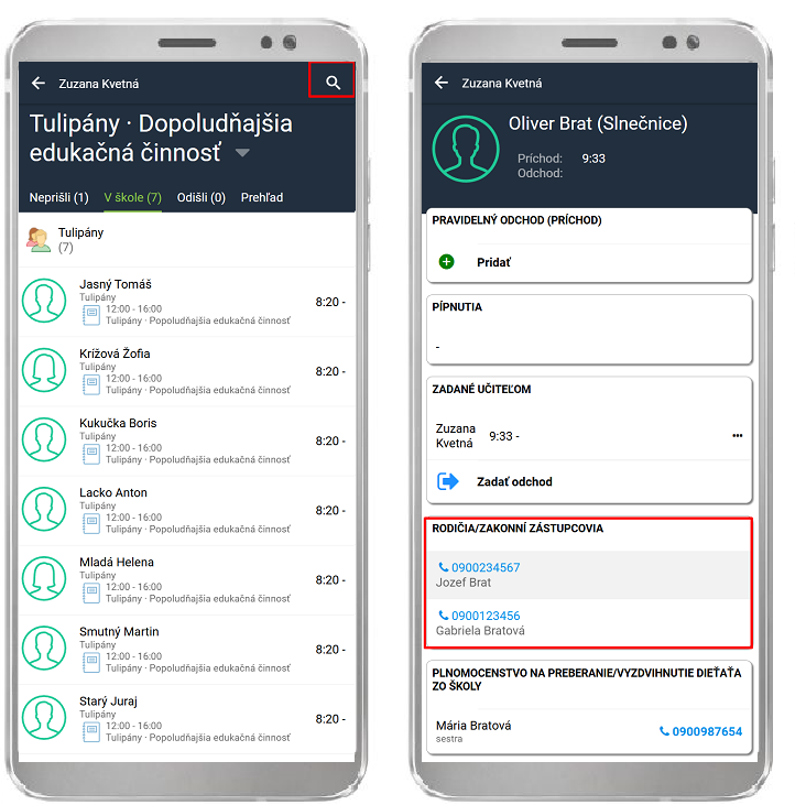 Vo vyhľadávači zadajte meno dieťaťa, o ktorom potrebujete informácie. Po kliknutí na dieťa uvidíte potrebné údaje, medzi ktorými sa nachádza aj telefónne číslo na rodičov/zákonných zástupcov.