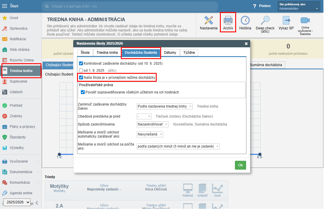 Prísnejší režim je možné zvoliť v Nastaveniach triednej knihy v časti Dochádzka študenta: