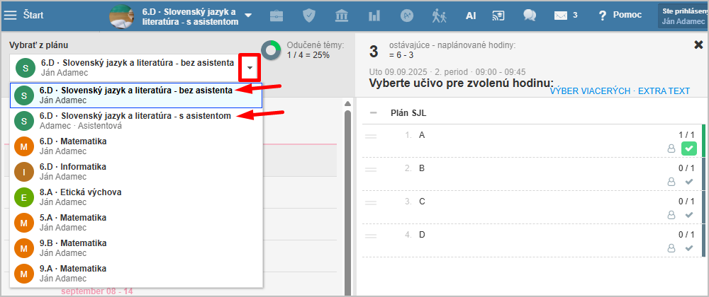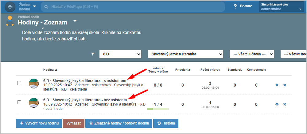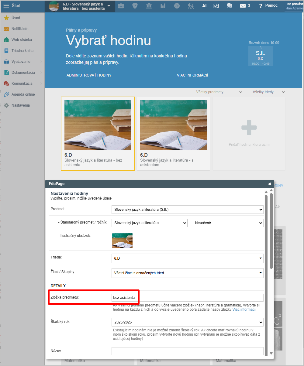 V zložke predmetu si nejako rozlíšte hodiny, napr. A a B alebo iným spôsobom. V našom príklade z dôvodu názornosti sme hodiny rozlíšili ako s asistentom a bez asistenta.
