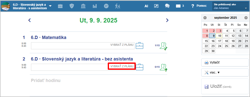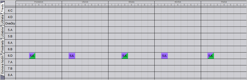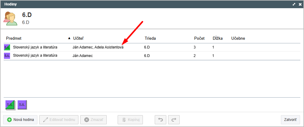 V rozvrhu treba zadať, koľko hodín je s asistentom a koľko bez asistenta. V našom prípade máme 3 hodiny SJL s asistentom a 2 bez asistenta.