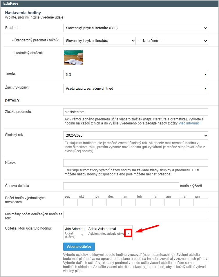 Pri hodine s dvomi učiteľmi, nastavte, ktorý je asistent.