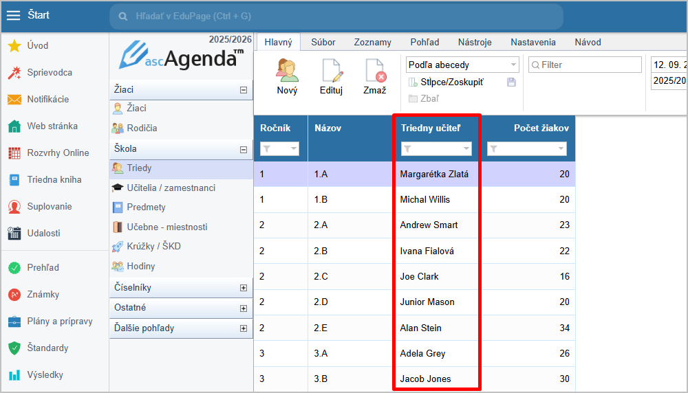 V Agende online kliknite na triedy. Dvojklikom si otvorte triedu, ktorej chcete nastaviť triedneho učiteľa.
