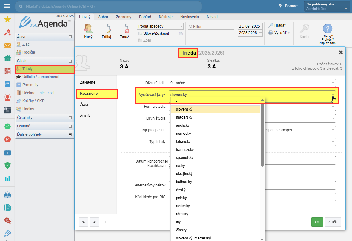 Vyučovací jazyk sa nastavuje primárne v karte triedy v záložke Rozšírené.