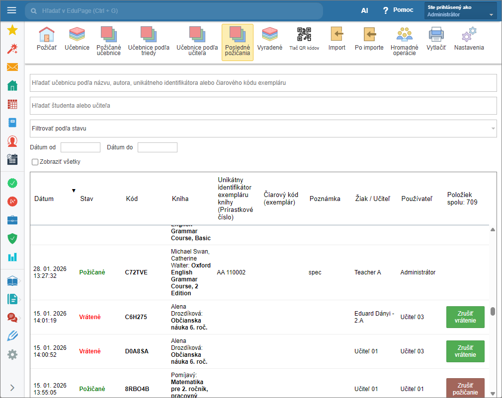 V zozname aktuálne požičaných učebníc viete vyhľadať, kto má ktorú učebnicu požičanú, kedy si ju požičal, viete ju vrátiť.
