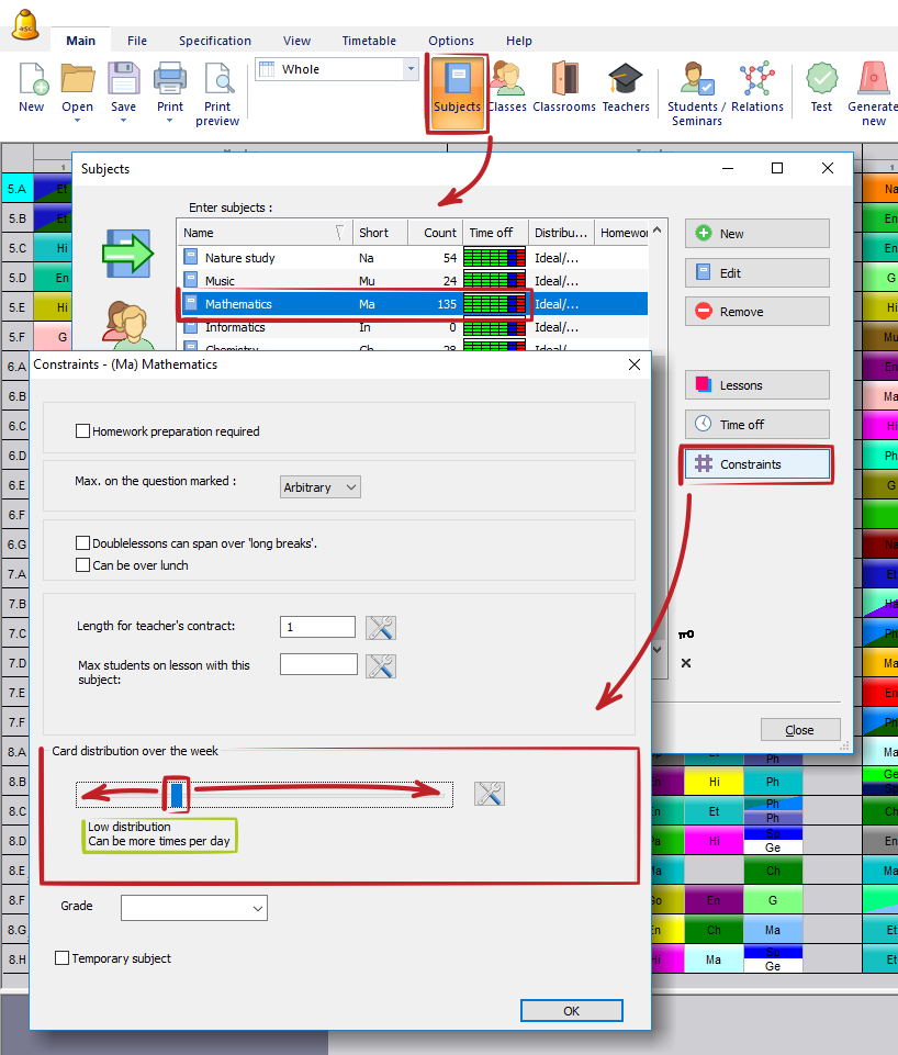 Within this distribution program checks two core constraints - "max periods per day" and "min days per week". Values for these two constraints program evaluates from division "count of lessons per week" and "count of days". The more the slider is to the right the more evenly the subject is distributed within a week.