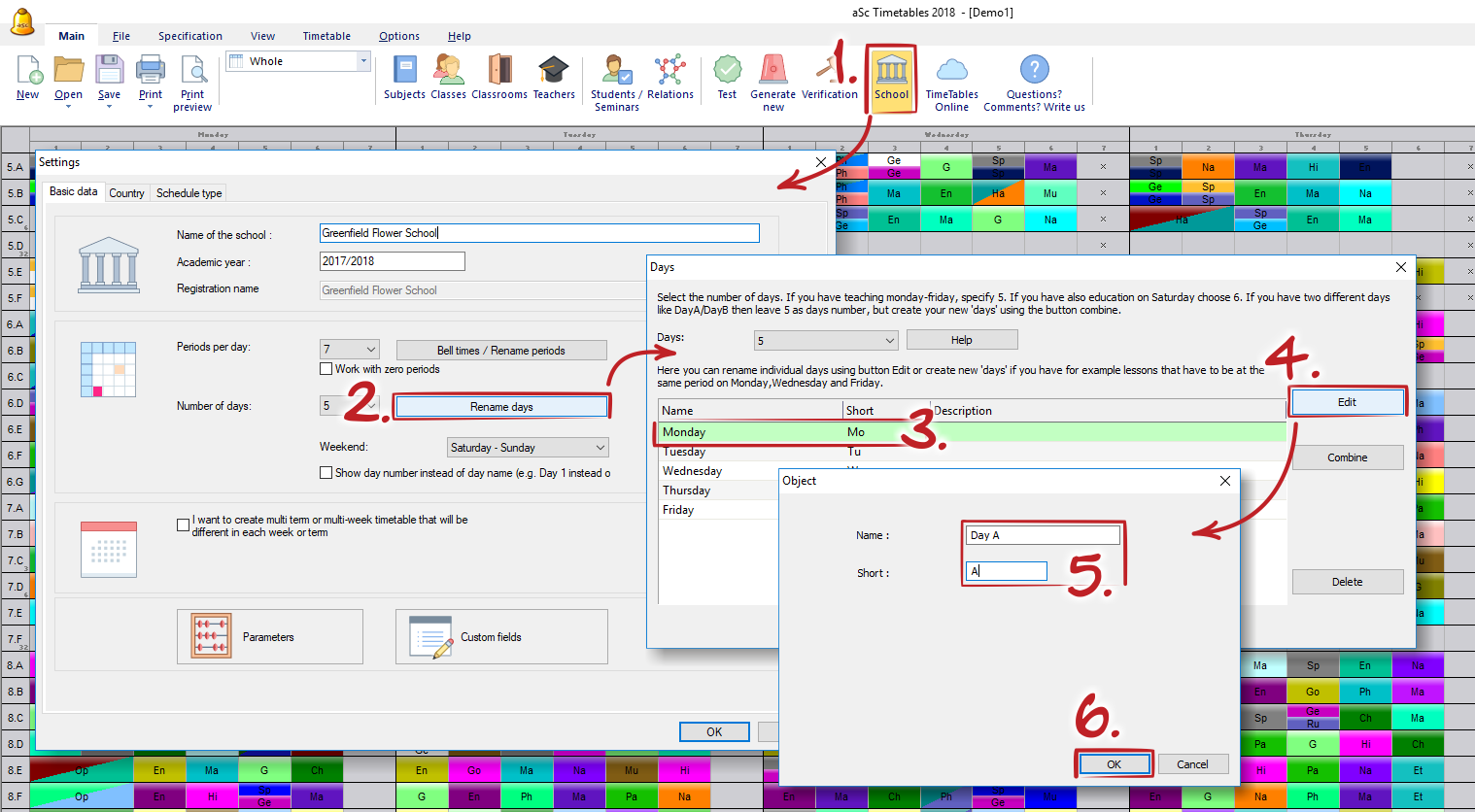 You can change the names of the days in main menu School - Rename days - select the day and click the Edit button: