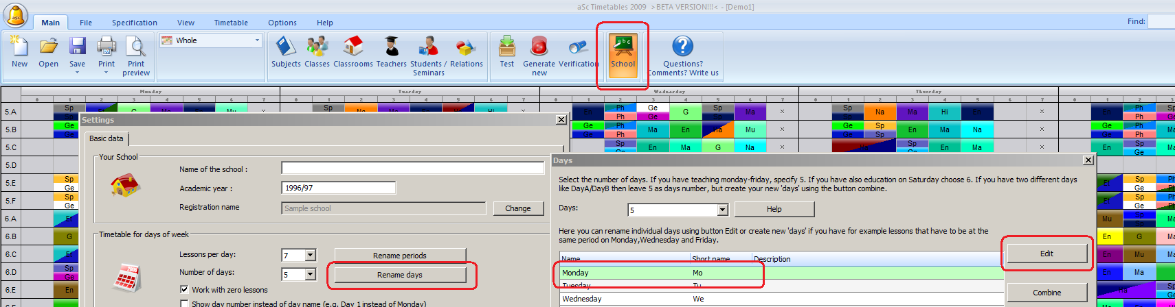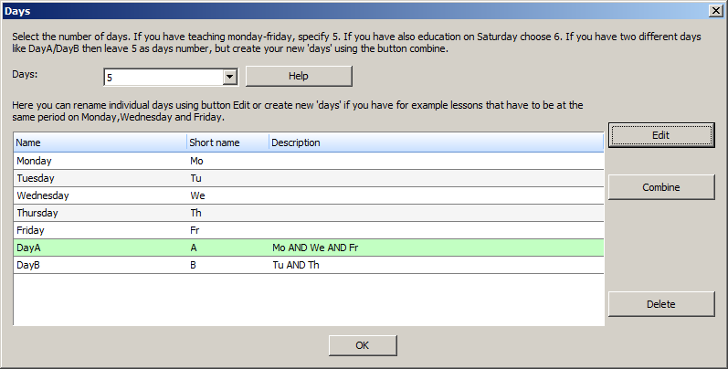 If your school has 2 different days Day A and Day B where DayA is Monday, Wednesday and Friday and Day B is Tuesday and Thursday. Then you can create new days A and B. Just use button combine: