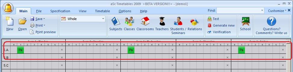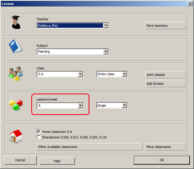 For each lesson, you can then define that this lesson can be on day A or B. Simply input the short name in the field with lesson counts. If you specified A, lesson will be placed on MW and F:
