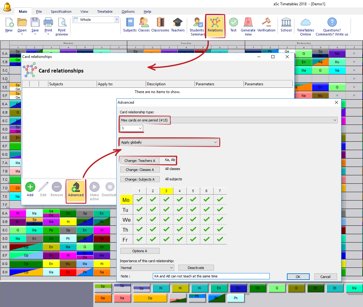 However if you really have two independent teachers, and you do not want them to teach at the same time, you can define advanced cardrelationship that says max 1 card on each position: