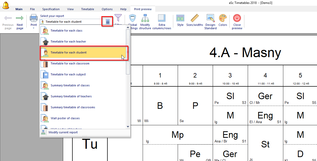 In case, you have inputted list of students in your timetable, then you will be able to select the printing report "Timetable for each student".